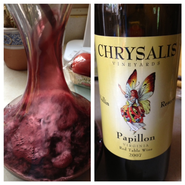 On this beautiful spring day, I will be opening a 2007 Chrysalis Vineyards Papillon, which means “butterfly” in French; there is a butterfly theme at Chrysalis, hence the name. Papillon is a Bordeaux blend of Tannat, a French varietal from the Madiran region of France and Petit Verdot, a Bordeaux variety that is typically used as a blending wine. However, Petit Verdot grows very well in Virginia that it is bottled as a single varietal. One day, I will do a review on Chrysalis wines and share the wines wonderful stories, to include the story of the Norton Grape, which I enjoyed sharing with customers.