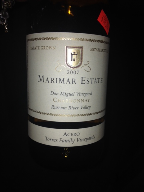 First, I check the refrigerator and there is an open 2007 Marimar Chardonnay from Don Miguel Vineyard. I take a sip….Ewww CORKED!