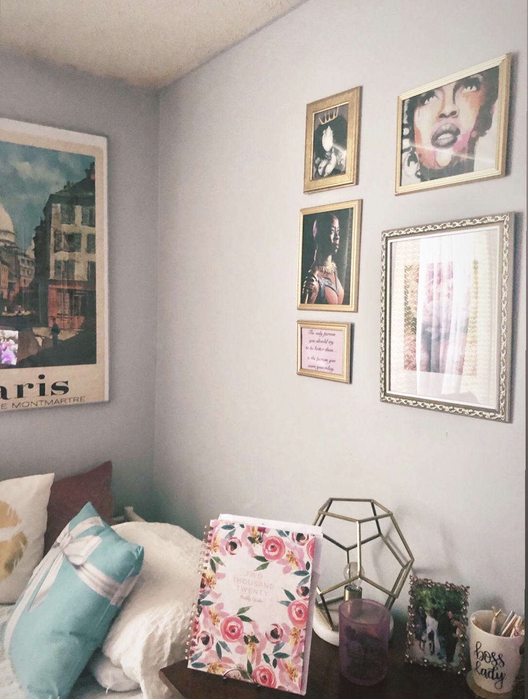 Years ago, I reclaimed a small bedroom, which was first my daughter’s room as a toddler, then transformed to a guest room and to an art studio. Since working from home became frequent, I required a dedicated space. I recreated my own personal space that represents the youthful girly-girl in me, which means lots of pink, gold and filled with inspiration. From my mother-dear to my daughters and their friends, they all have enjoyed staying in my fun feminine room.