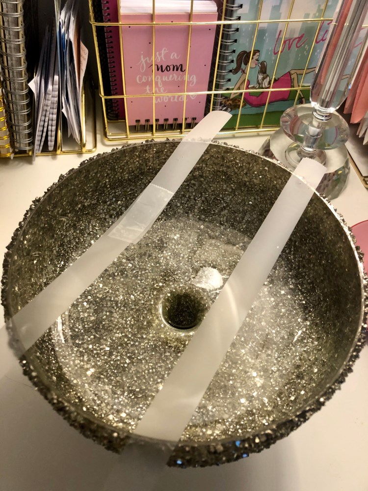 I’ve seen Instagram home decor influencers use tape across the opening of a vase. The flowers fresh and artificial are displayed perfectly and beautifully in the vase; looks so simple. Of course, I had to try this new vase styling method. I purchased this beautiful gold vase from inspiremehomedecor.com, “small jeweled decorative glass bowl” for only $42.99; they also offer a large size.