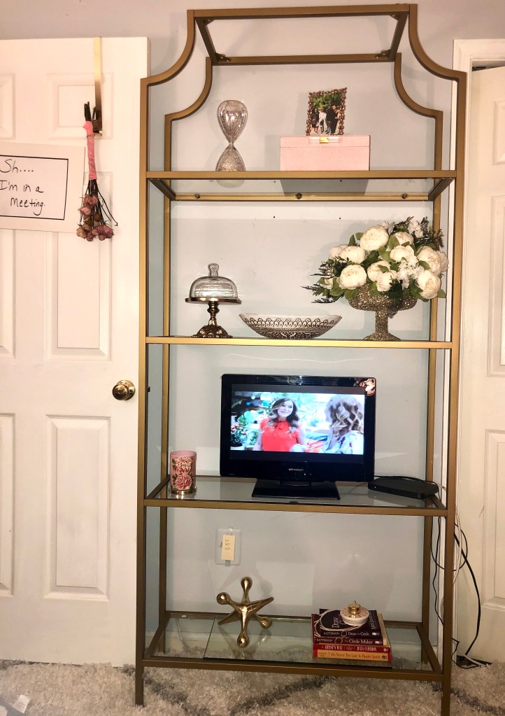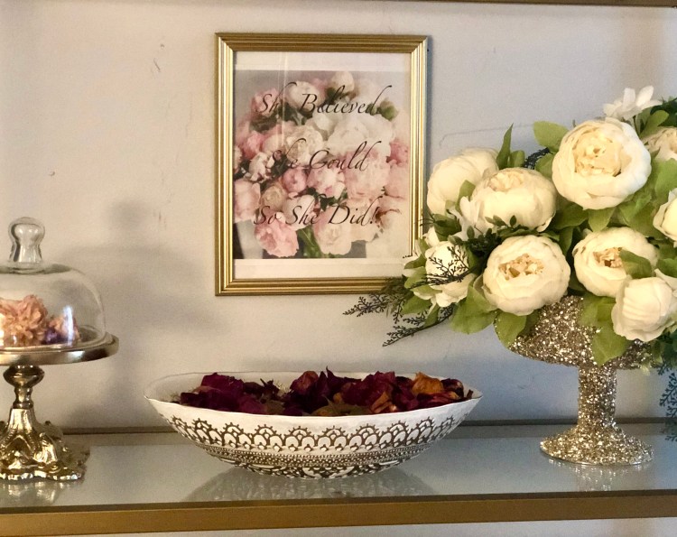 Also styled on the bookcase shelf are fresh rose petals in the oval bowl purchased from Home Goods, a wax dip carnation in the gold dome stand, which is also purchased from Home Goods and a computer printer sign “She Believed She Could So She Did!” placed in a Dollar Store frame.