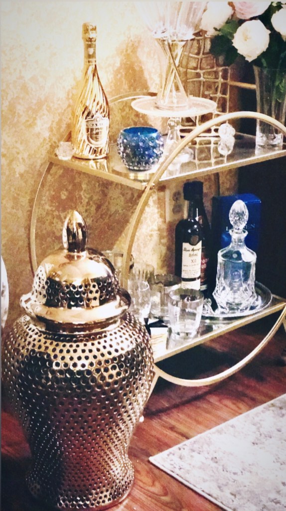 I styled the Ginger Jar next to the barcart from Wayfair, for now. The LOVELY real touch peonies have been added to the vase with the pink and white roses and coasters, which are also from Inspire Me Home Decor.