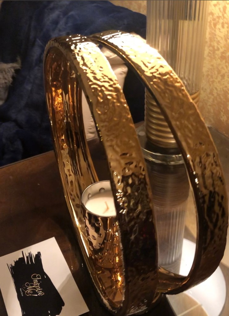 Last but not least, LOVE this tray with its gold skirt, hammered handles, smooth textured glass and round peg feet. I’m waiting to receive one more order from the Inspire Me Home Decor Friday New Product Drop; I will be able to style this BEAUTIFUL tray; so stay tuned!