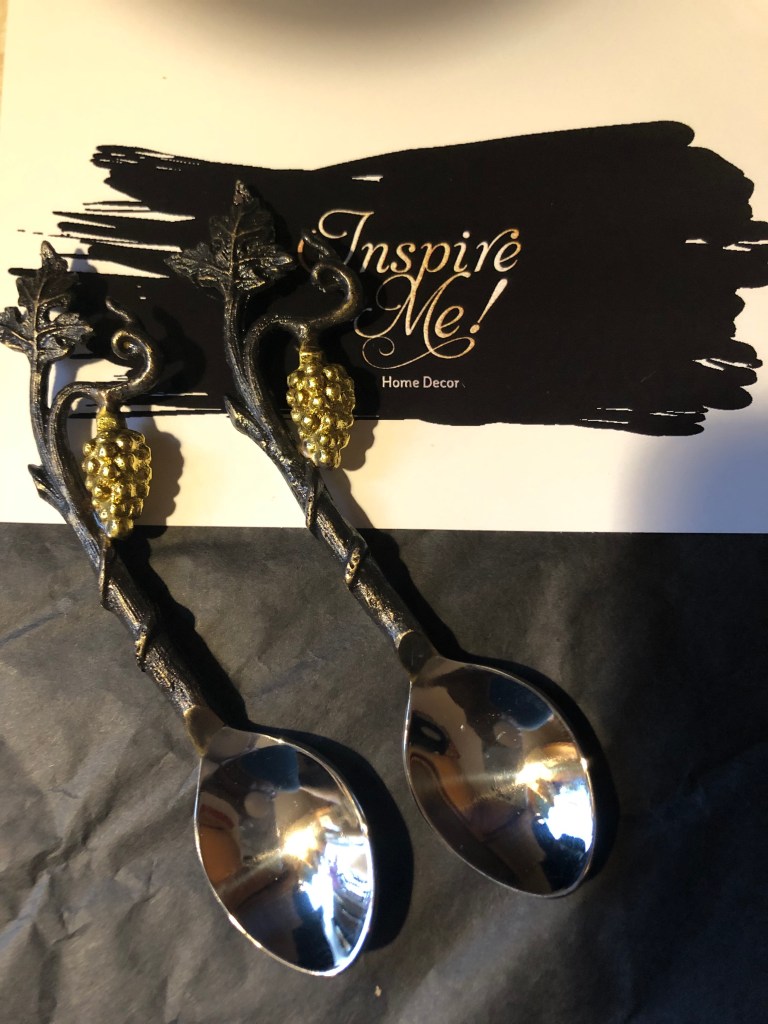 Since this is an Inspire Me Home Decor Products blog, I decided to share my other Inspire Me finds: A stunning glass vase, grape vines spoons, gold hammered jar, gold circular candle holder, marble and gold trimmed tray and white and pink roses.