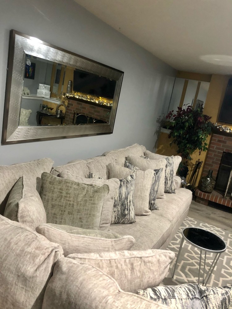 I did not care; I love this sectional and I will make it work. The look on the movers face was “Are you for real?” Reading his mind, I said, “I’m not returning it, I want it”. He immediately pulled out a “no liability” form for me to sign. I signed it and the movers went to work squeezing the furniture down the staircase into my family room. Honestly, if they tilted forward the sofa, which was the biggest and longest piece of the sectional, my daughter and I both believe the wall and light fixture would be intact. At the moment, I did not care. I will admit, I felt bad for the delivery guys, they worked hard trying to get the furniture into the space. So, I gave a nice tip and said lunch is on me.