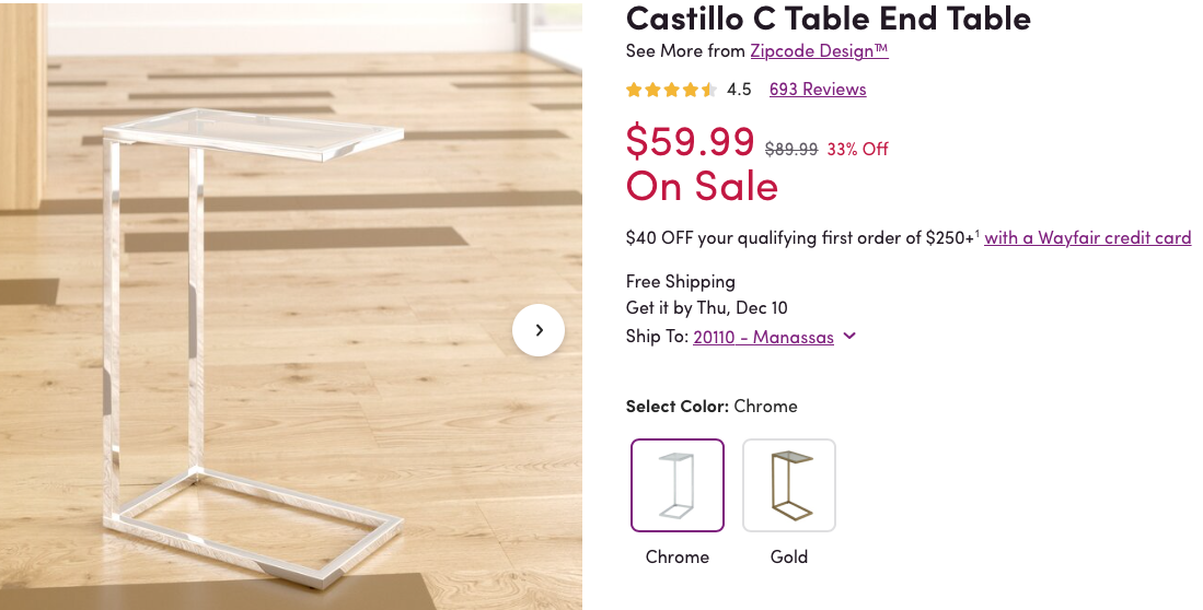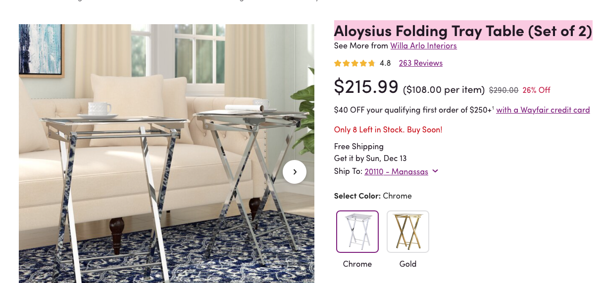 Thirdly, the sectional is so large that I cannot fit a decent size coffee table in the space. My girls will be stuck with C end tables or decorated tray tables that they can move around. The space also need ottomans for friends to rest their feet. Right now, I have my eye on Wayfair’s Castillo C End table and Aloysius Folding Tray Table in chrome. I just do not like that $200 price tag on the folding tray tables.