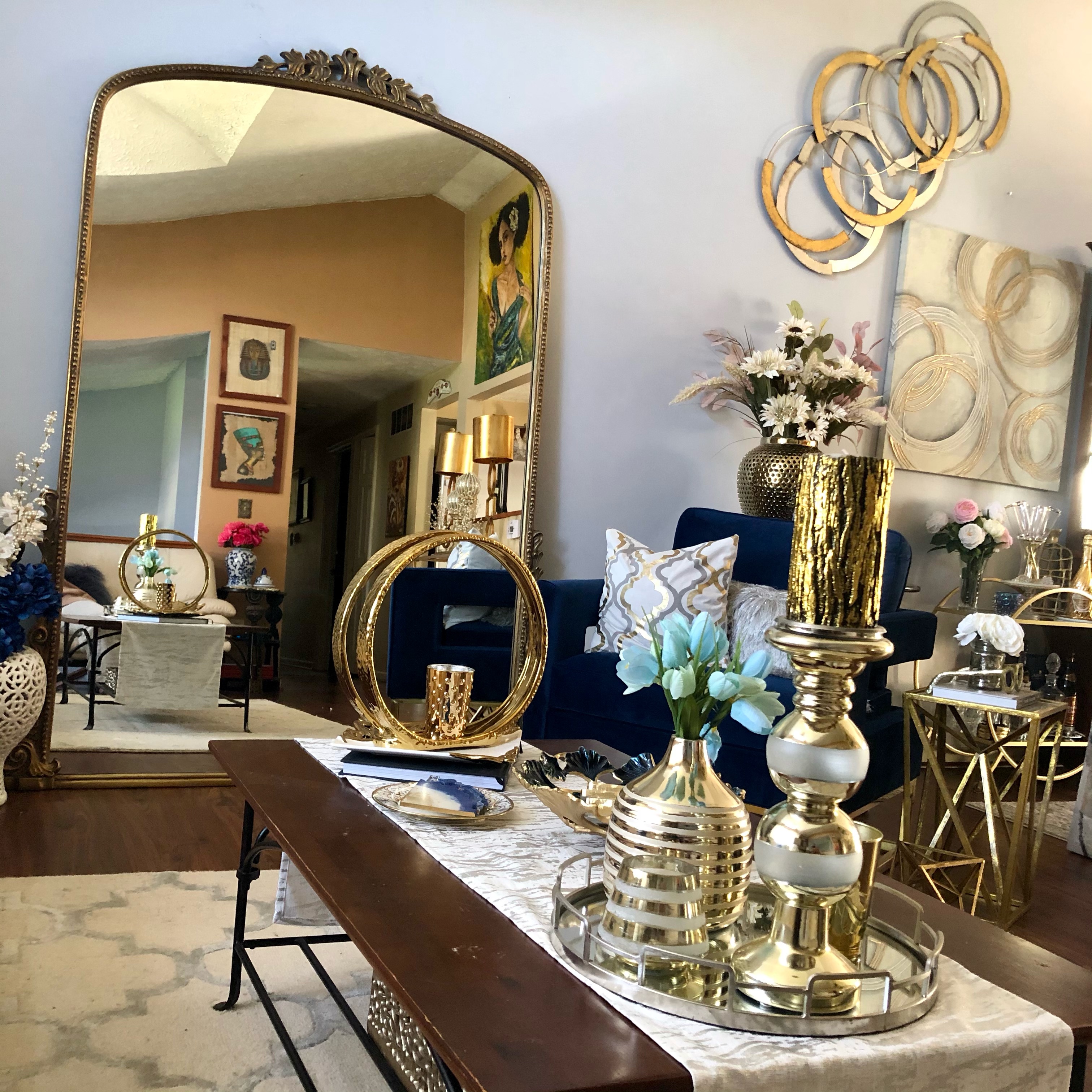 My living room transformation is coming along smoothly. I finally made a decision after two weeks and selected a new coffee table. I deterred from my original design plan. Shoot! I have been deterring, swerving during this entire living room remodeling. The original design plan did not include a Primrose mirror and all gold end tables. I can not help myself; when I see a decor piece that makes my heart skip a beat, I have to have it and I will worry about finding a home for the new piece later.