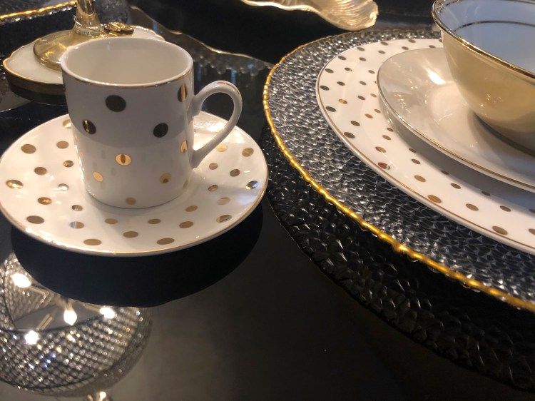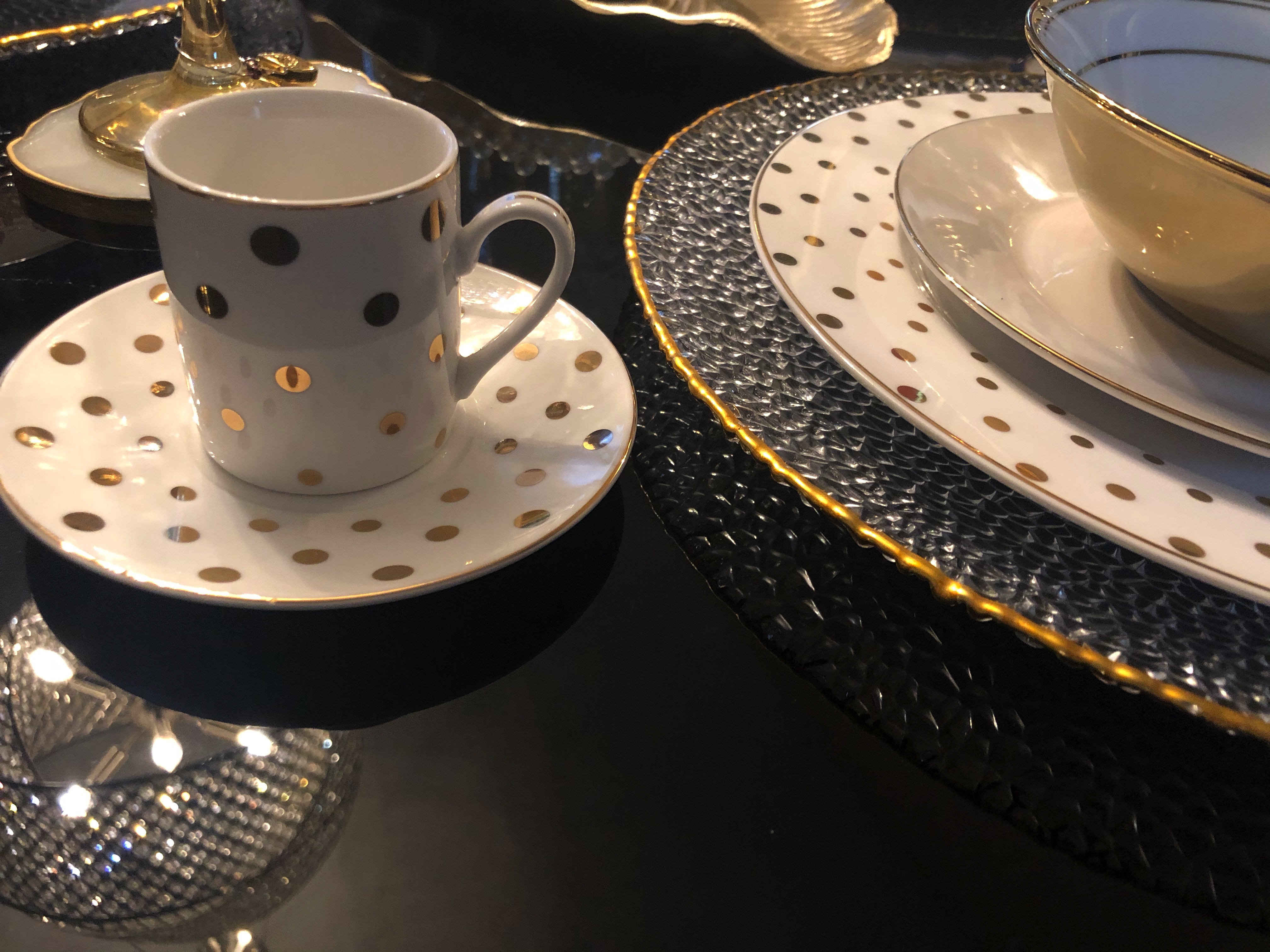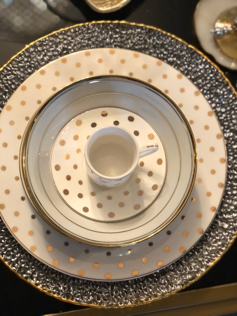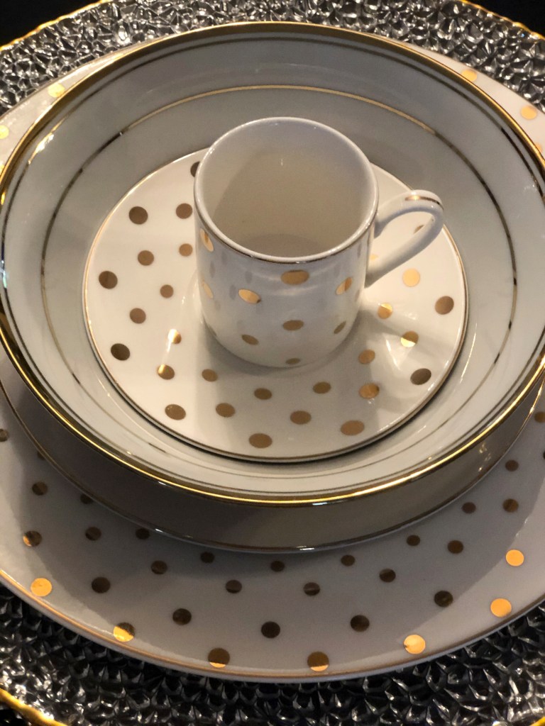 Polka dot plate $4.99 (Hobby Lobby), white gold trim saucer $2.99 (Hobby Lobby), Luxe gold bowls $3.99 (Home Goods) and napkins $17.99 for 6 (Amazon). Sorry, I do not recall the costs of the glass charger and polka dot expresso set, which was purchased from Home Goods.