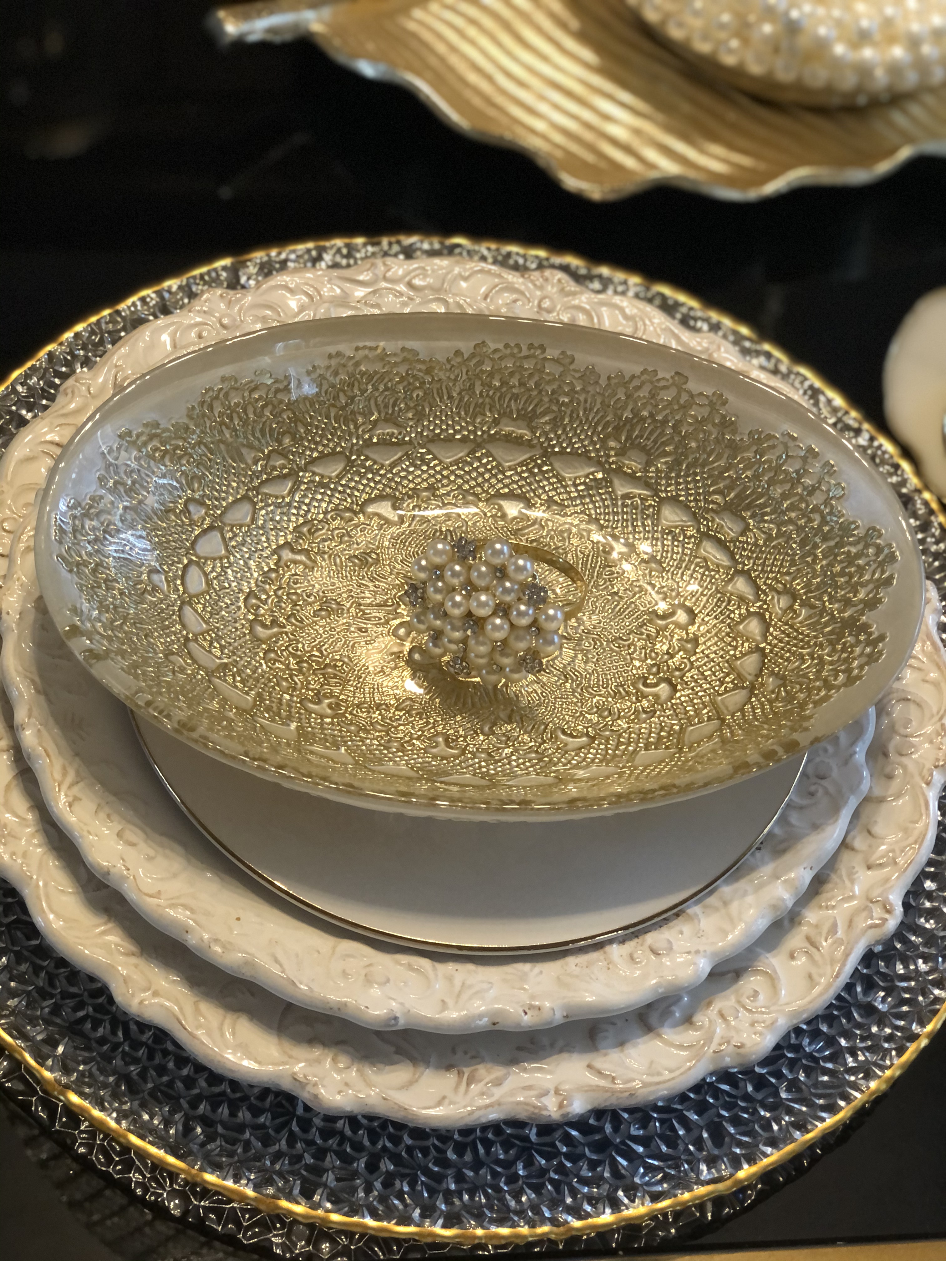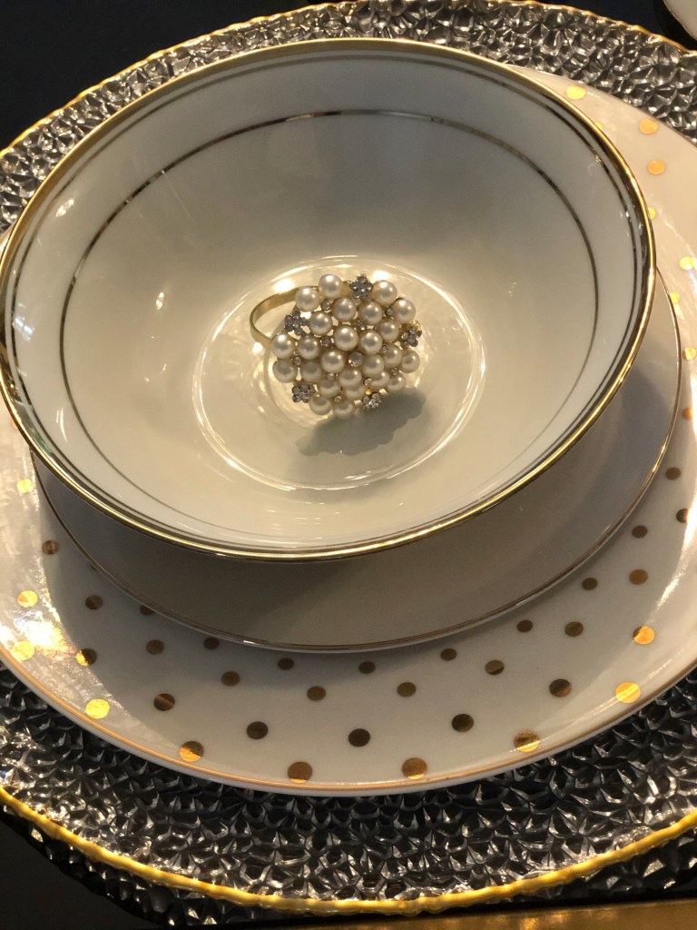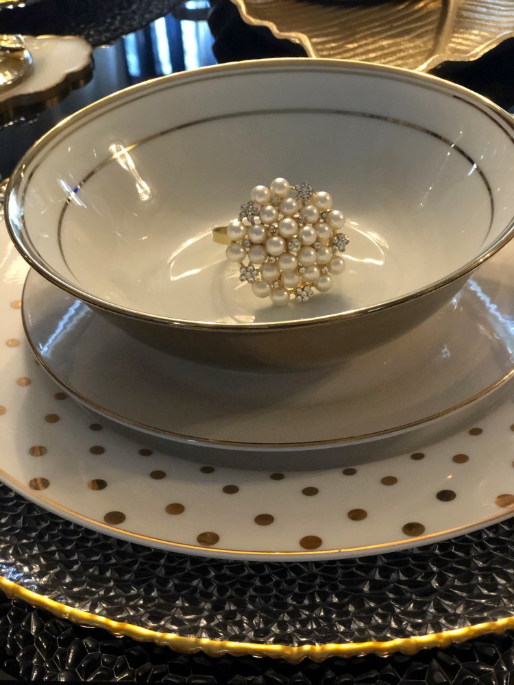I love my before layout. I had the white dishes for years, which I purchased from Pier 1. I love the classic design. The chargers and the oval dish are from Home Goods. The pearl napkin rings were purchased from Amazon. The napkins are missing from the place setting because my white and gold napkins are in the garage, with the tree, blocked by furniture. I refuse to buy more napkins. Well, the truth is, I’m not actively looking and haven’t come across any that WOW’d me.