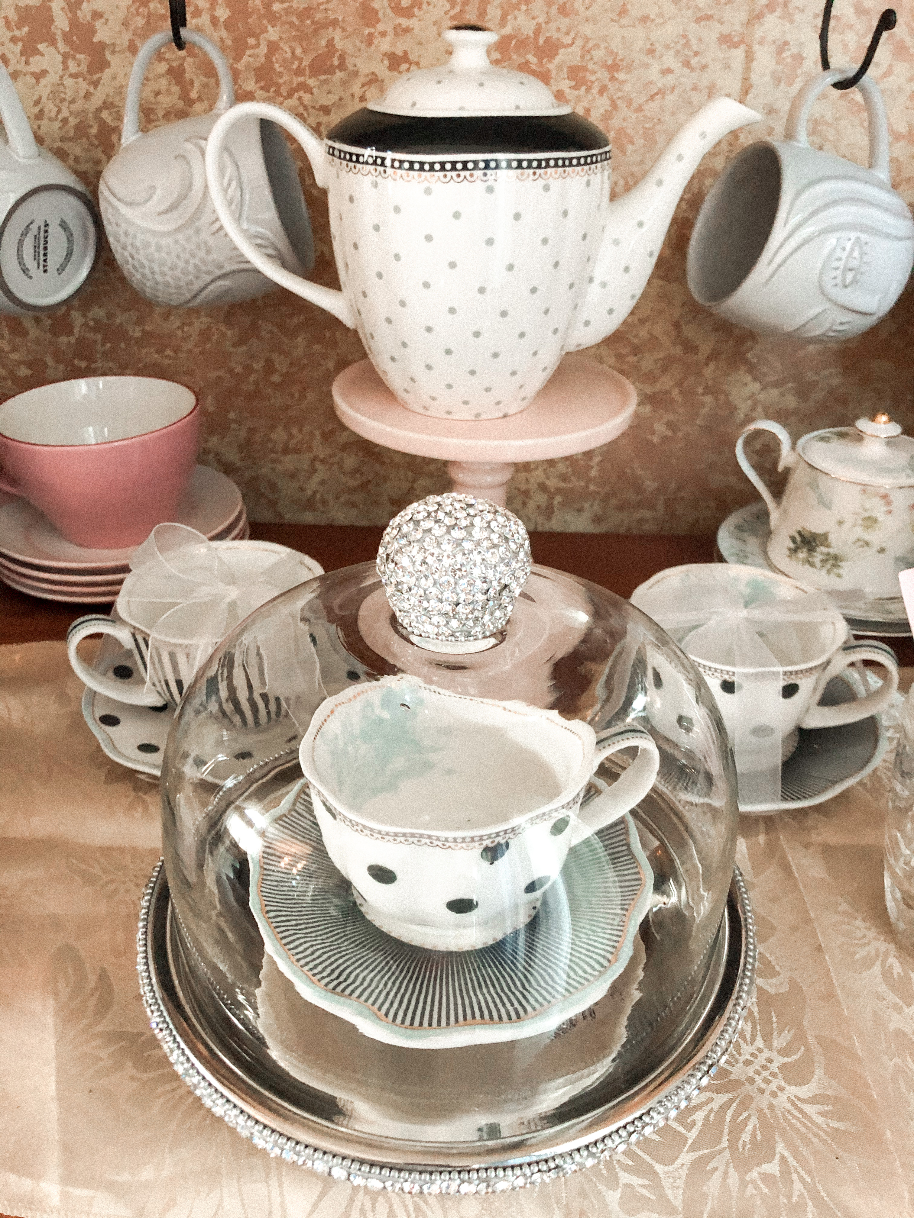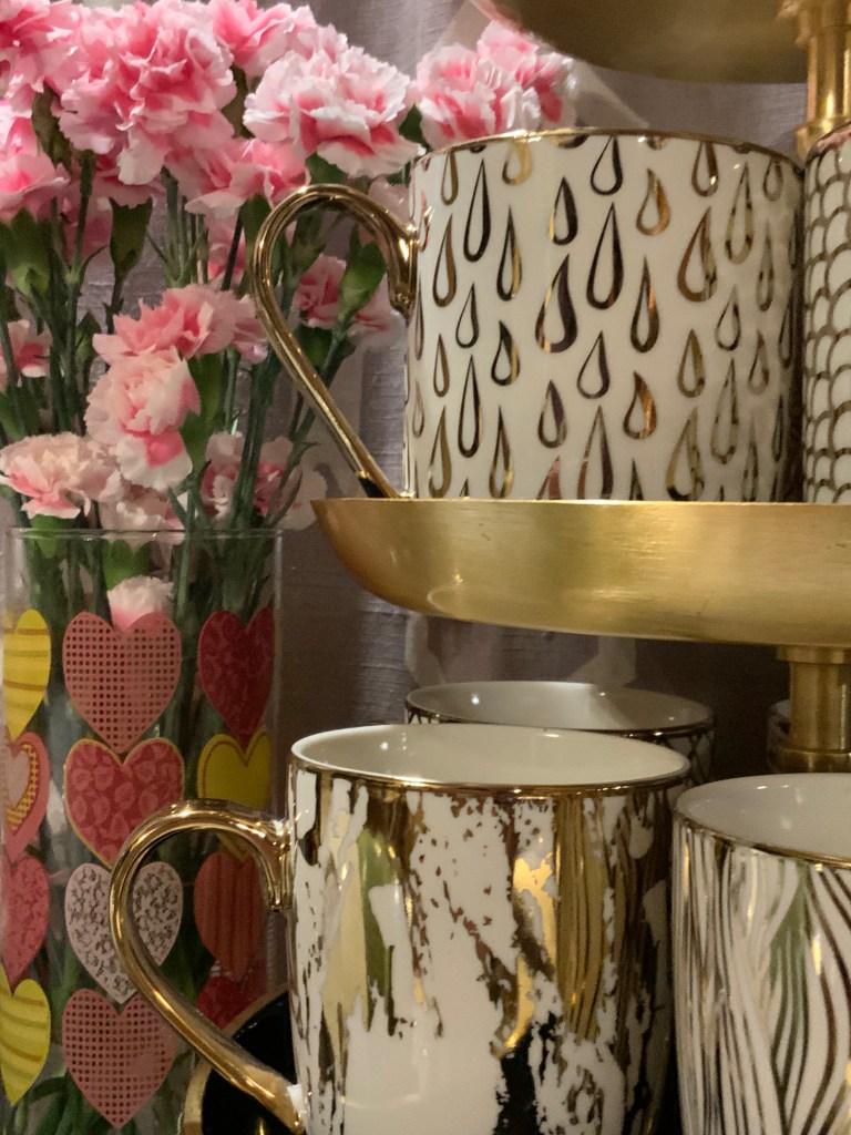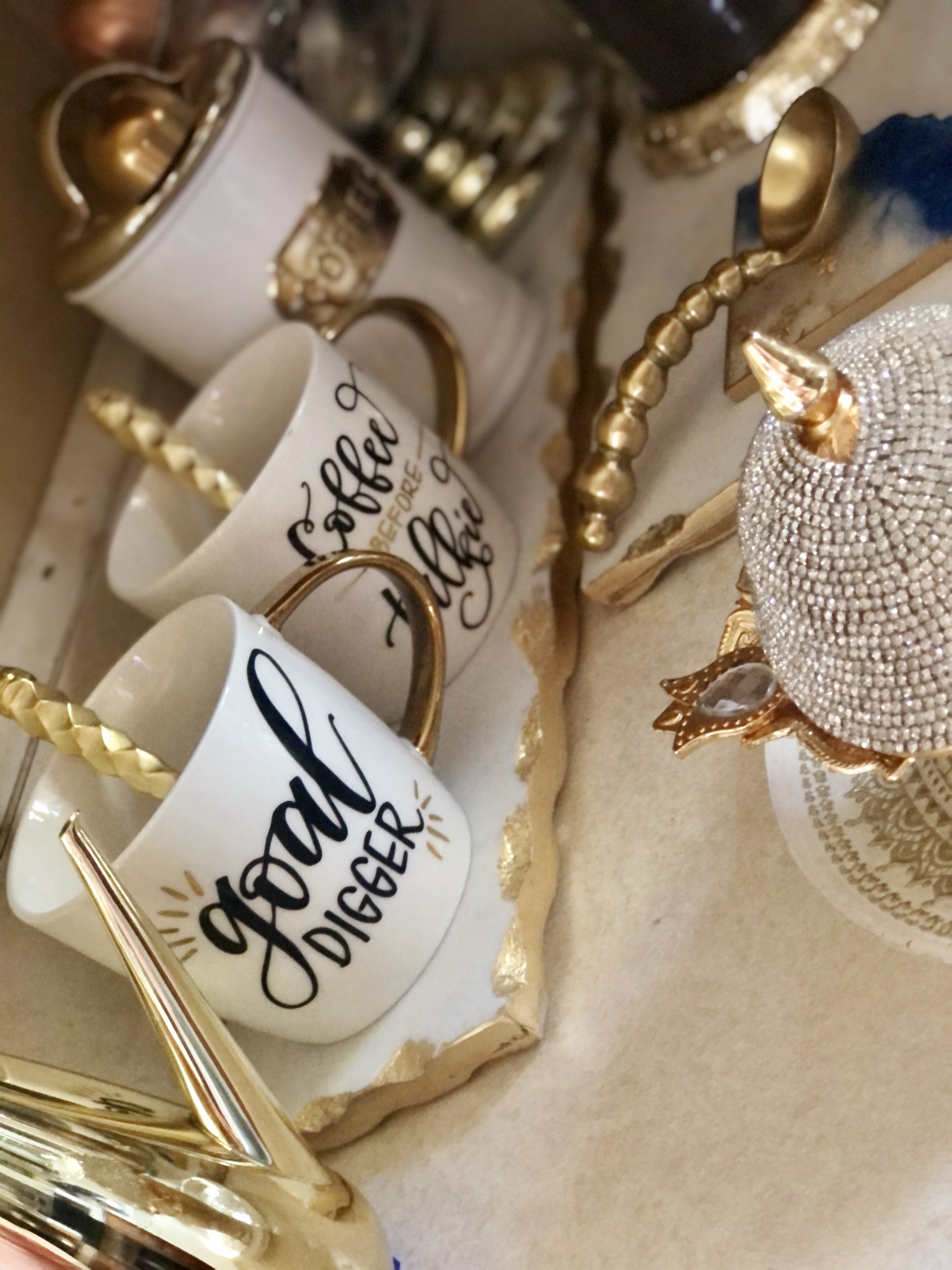 Gold and white mugs from Inspire Me! Home Decor, mermaid mugs are from Starbucks and polka-dot tea cups and black & white inspirational mugs are from Home Goods.