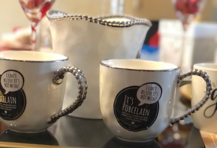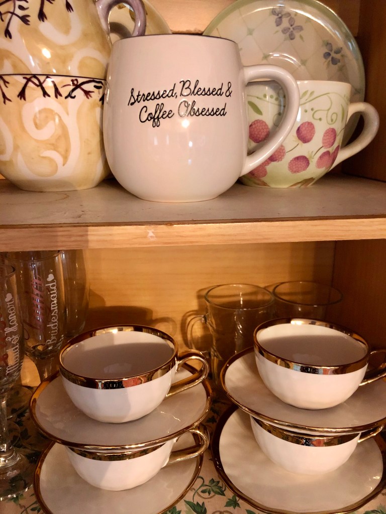 1 – Gold mugs from Wayfair; 2 – Glass coffee mugs from Ikea; 3 – Stressed, Blessed mug from Inspire Me! Cappuccino saucers and cups from Home Goods and Tracy Porter large mugs and plates; 4 – “So Not a Morning Person” mug from Inspire Me! & others from HomeGoods & Target; and 5 – Tracy Porter saucer and mugs.
