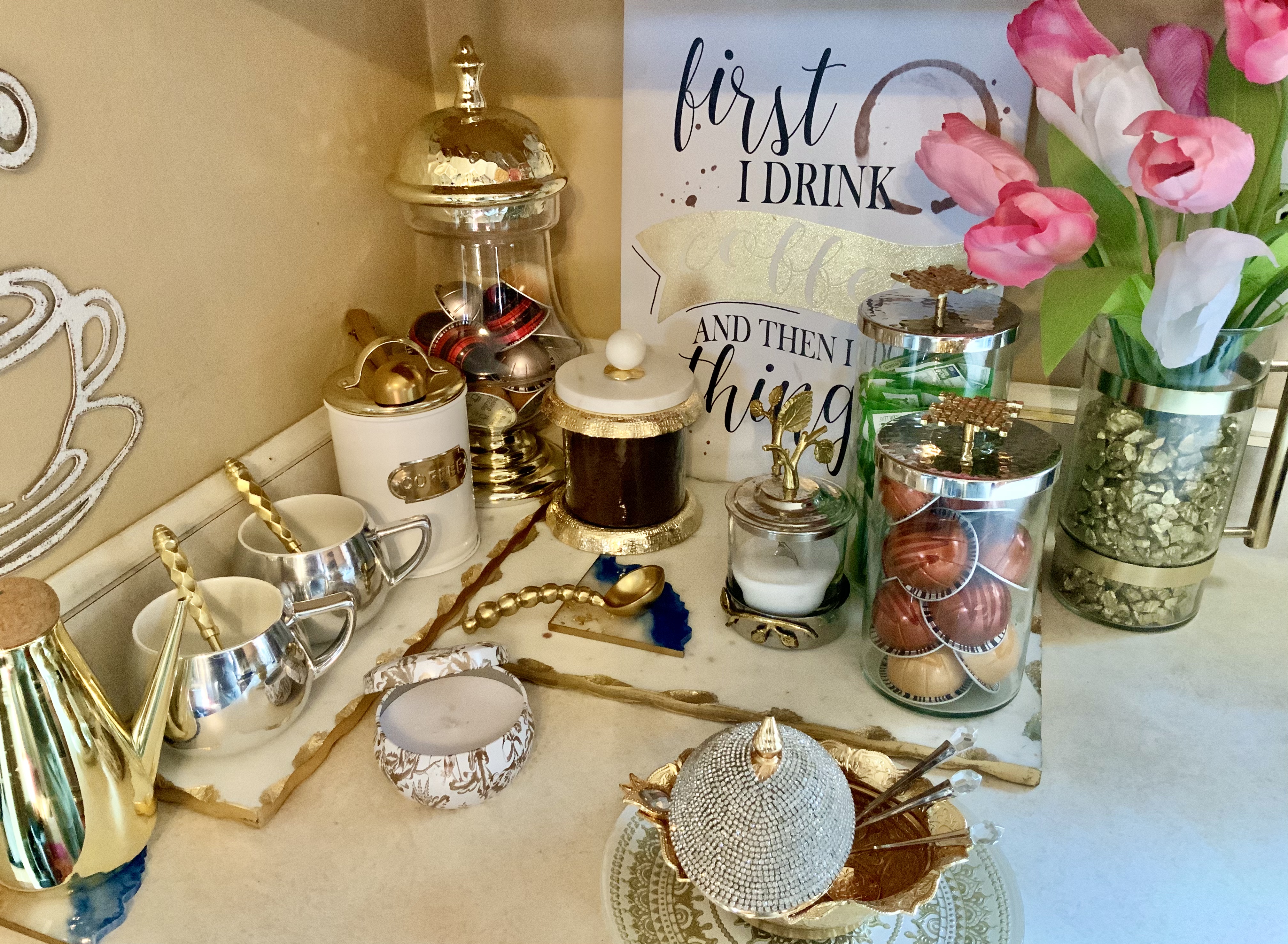 Every time I enter my kitchen and see my coffee stations, I am filled with joy. Plus, the addition of fresh flowers will brighten any space and person.πΉOther than finding trays to place under the kettle and the Nespresso machine, my coffee station will be complete and officially “Glammed Out!“