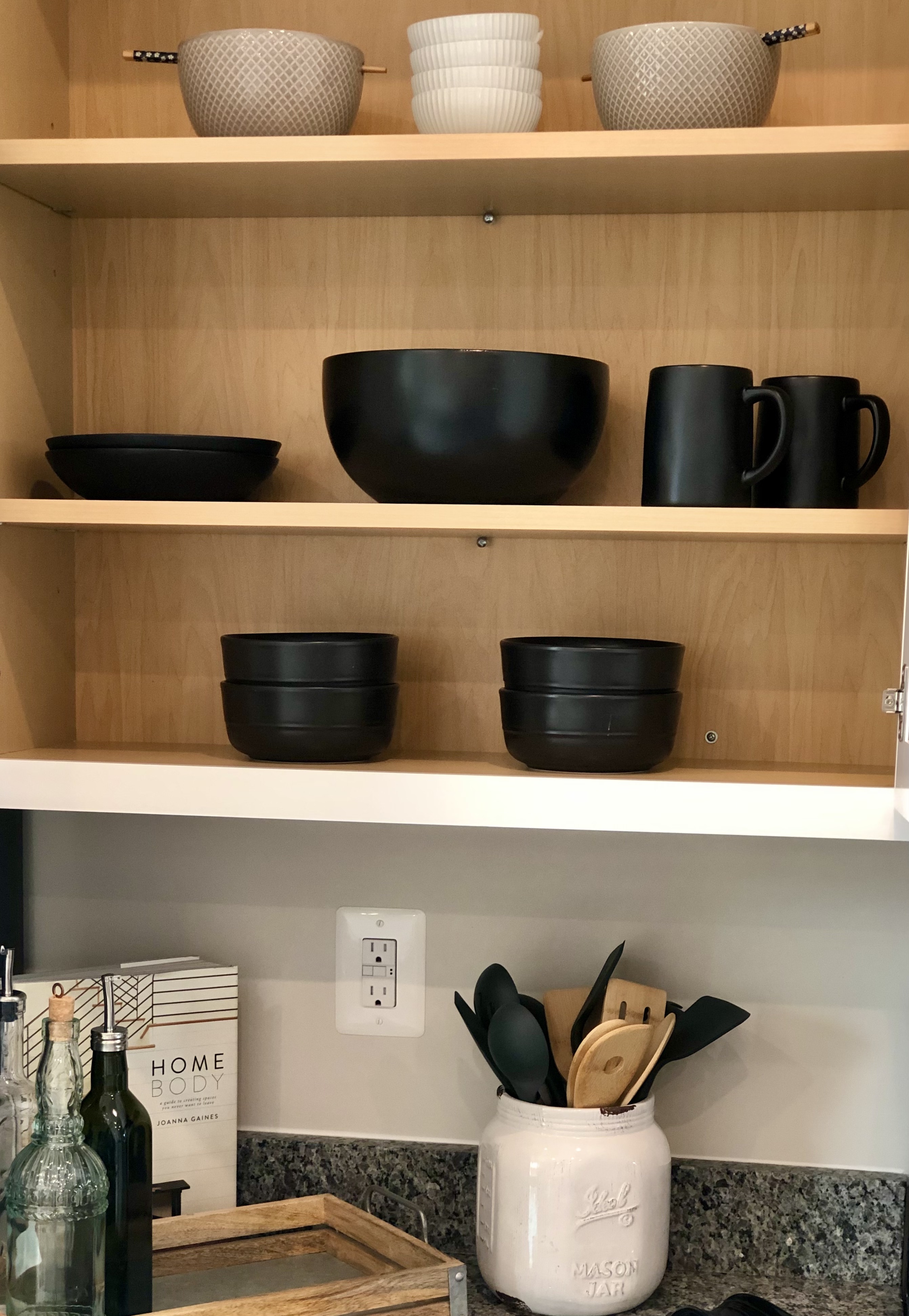Pay no mind to the multiple oil bottles in different styles; this is a result of purchasing items months in advance and forgetting what you purchased. She already wants to change the utensil holder. 😊