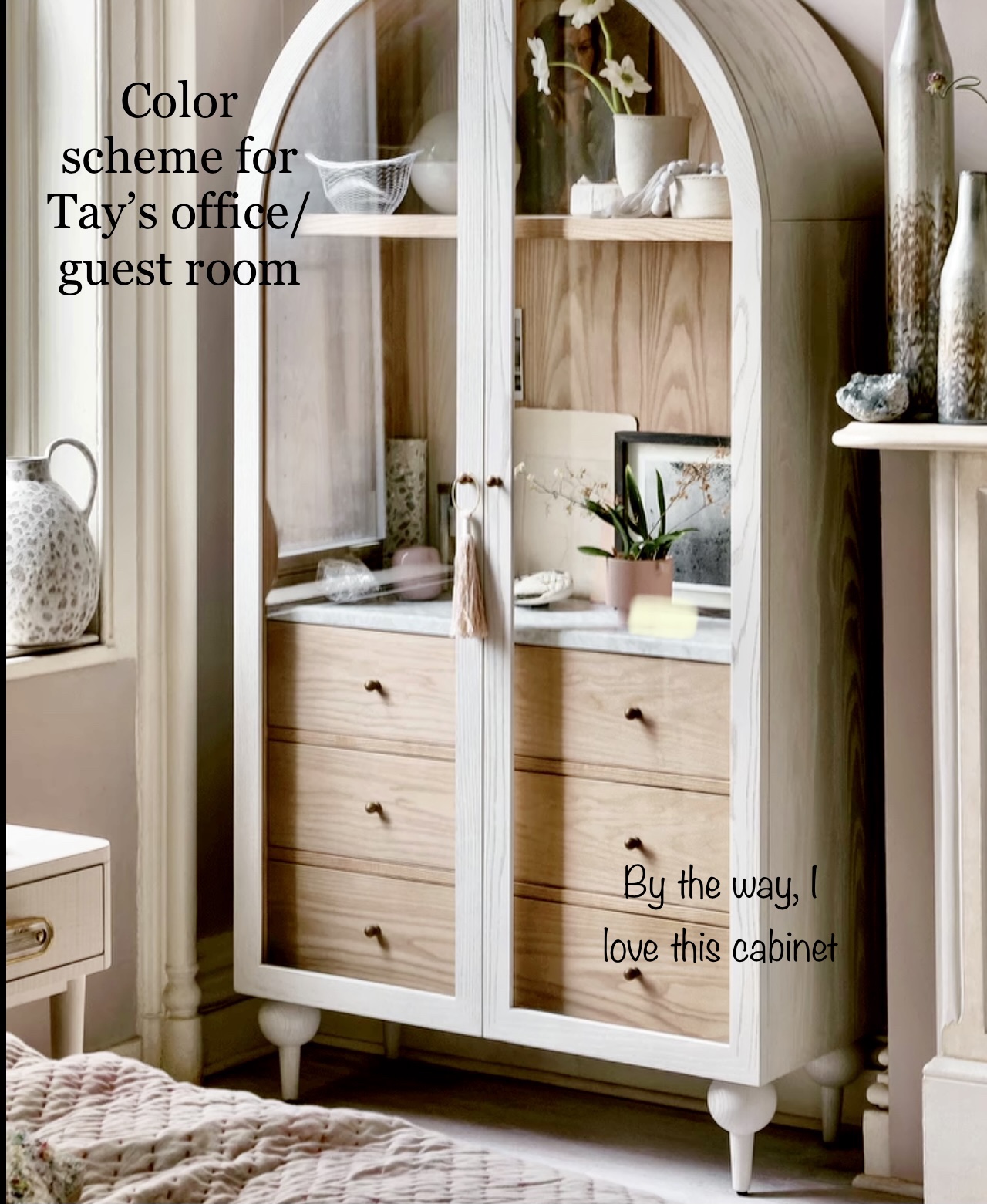 Second, I was out of my comfort zone decorating her office/guest room. As soon as I saw the “Fern Storage Cabinet” from Anthropologie, which cost $2,498.00. I knew instantly I found the color scheme for the space. The cabinet would be perfect; but, it is too large for a 8’x7′ room and over my budget.