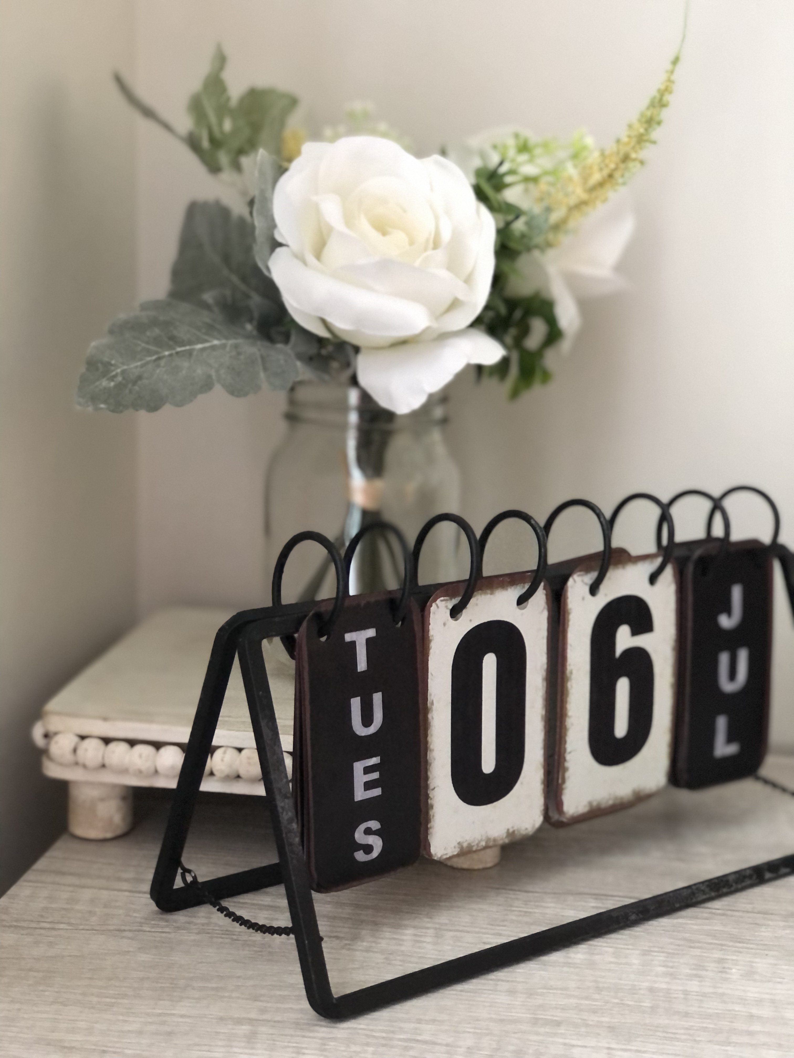 The calendar I felt was so unique and added a little farmhouse to the decor is missing the card for Monday. For laughs, I kept the calendar because Monday is least liked day, anyway! 😂