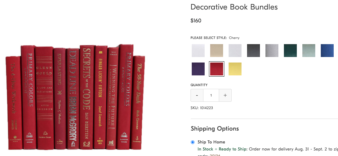 If you do not have the time to hunt through a bookstore, here is a link to one of my favorite home stores, West Elm that sells decorative books by color.