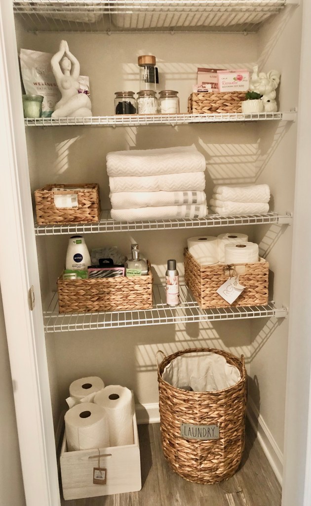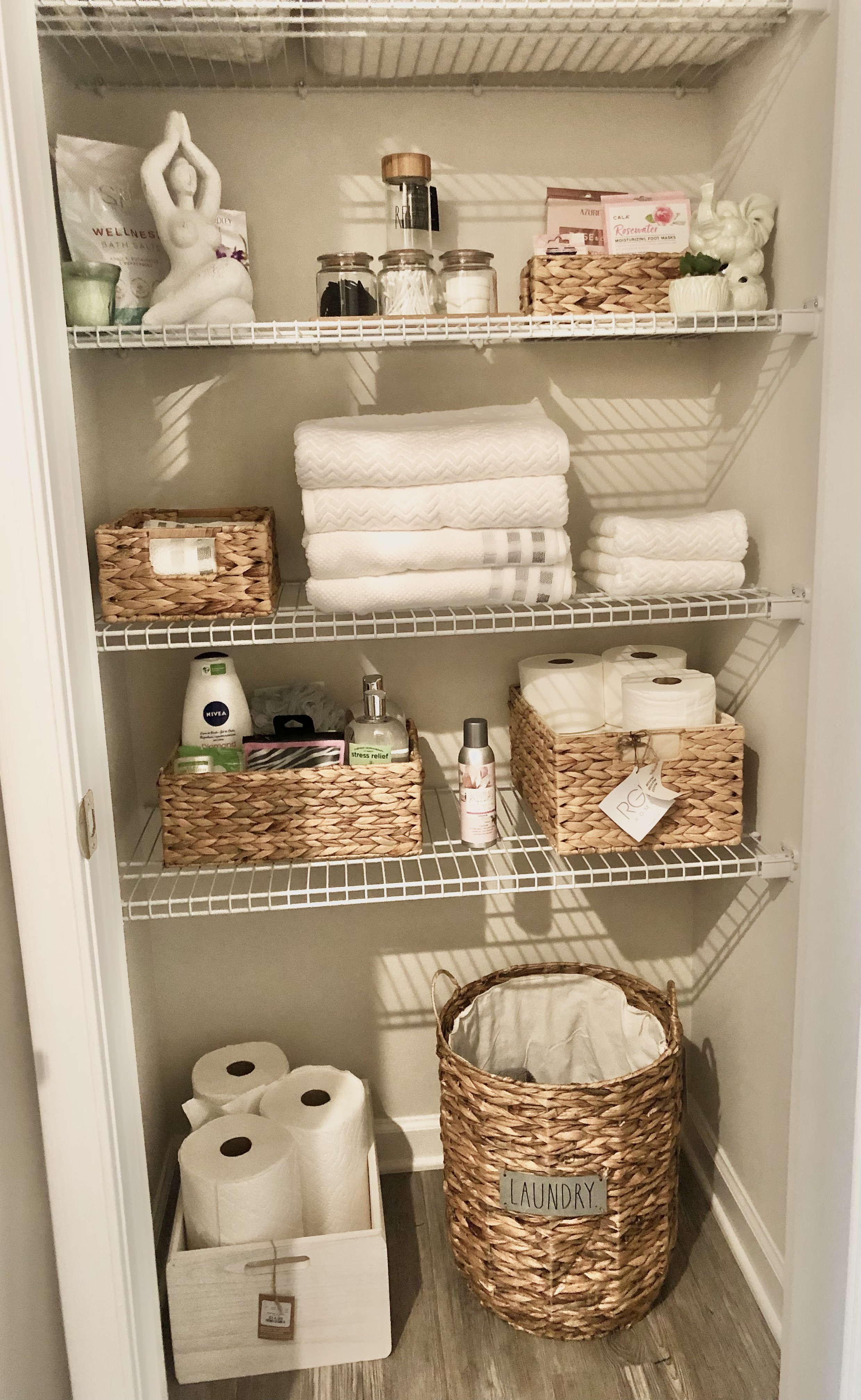 Our schedules have been so busy that I have not had time to complete the linen closet. For instance, place the hand towels, sheets, hand soap and room spray in baskets and place bath salts and epsom salt in jars.