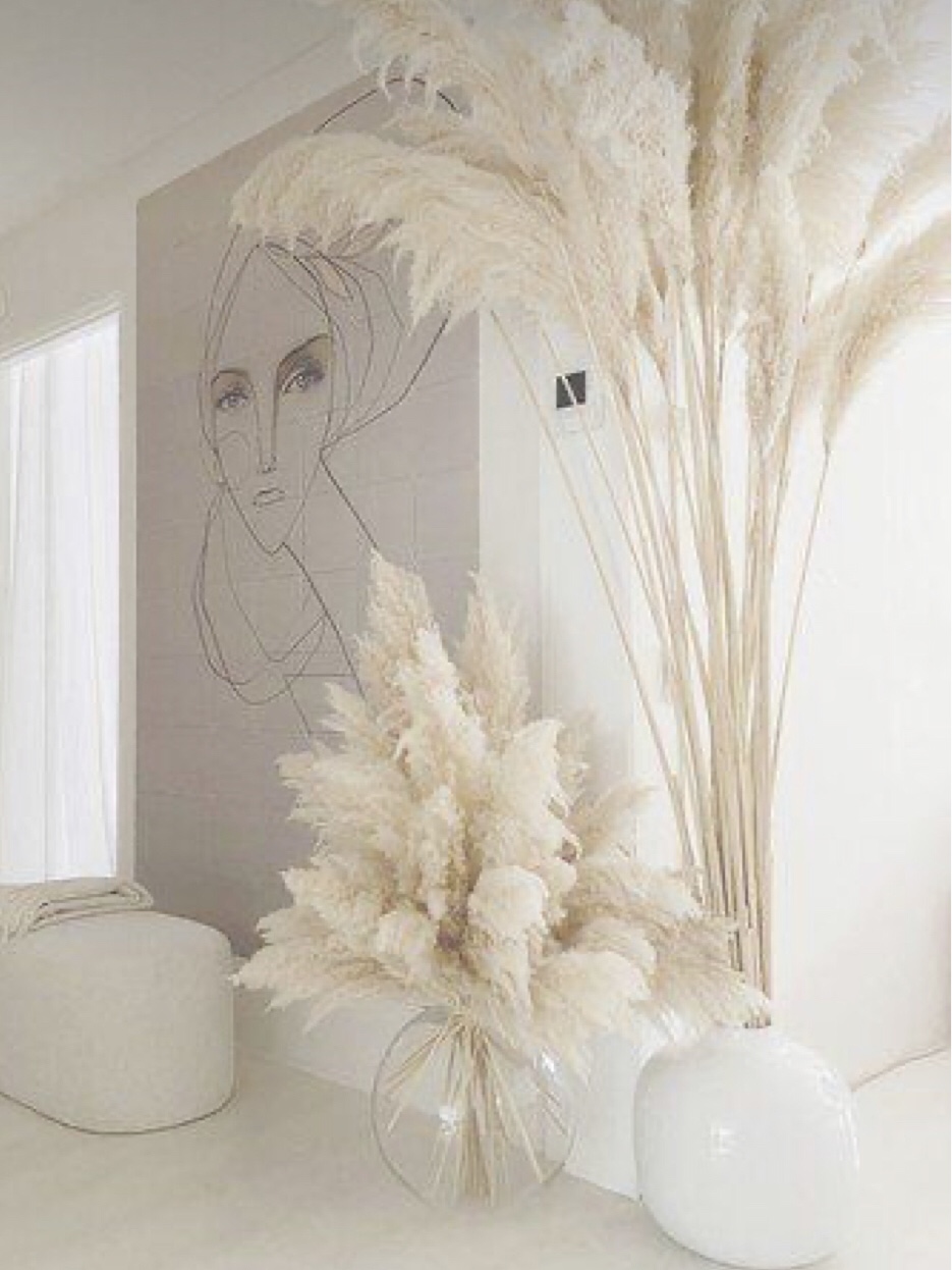 Tall white/ivory pampas thats reaches the ceiling and place on the side of the sofa. – I love everything about the below picture, especially the extra tall pampas stems.
