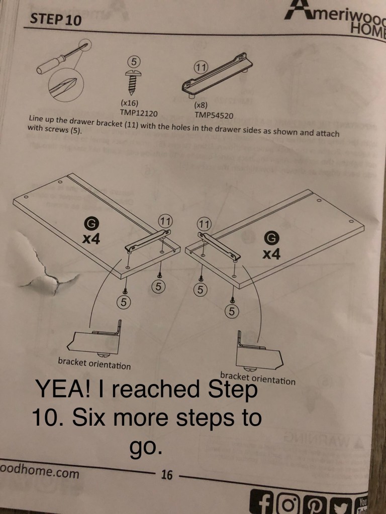 FOLKS, the last screw has been installed. WOO-HOO! I did it! Time to insert the drawers.๐ค๐พ Confession: I just pushed away the thought, “Do not “bust-up” the dresser if the drawers do not fit.” ๐ฅด
